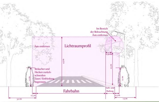 - Das Strassengebiet ist bis auf eine Höhe von 4.5 m und wenn die öffentliche Beleuchtung beeinträchtigt wird, bis auf Lampenhöhe von einhängenden Ästen freizuhalten.